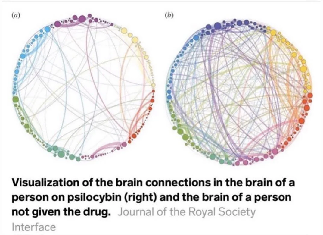 The data visualization below (b) shows how these new connections among separate regions of the brain in people dosed with psilocybin; the one on the left (a) represents the conventional connections in the brains of people not on the drug. You can see how much more connected the psilocybin-activated brain is... These new highways of information may be the reason mushroom users see sounds or hear colors. And they could also be responsible for giving magic mushrooms some of their antidepressant qualities.